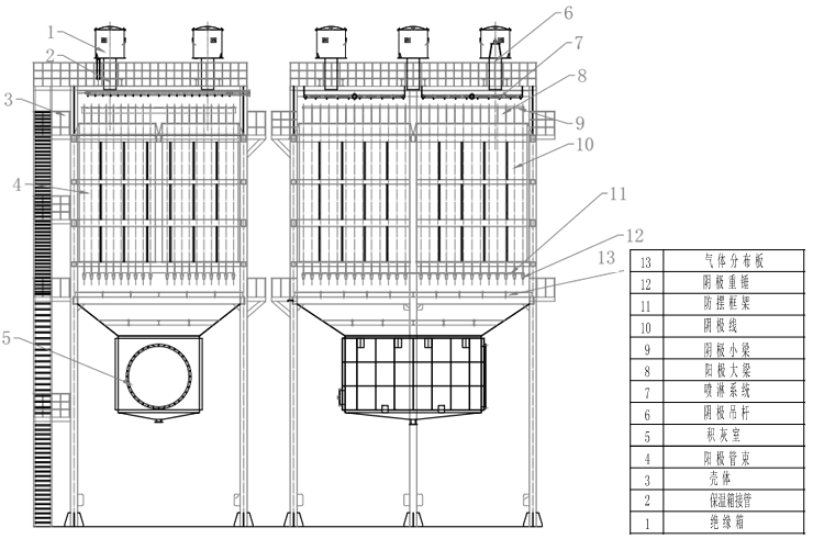 河北威美實際運行的一組電除霧器示意圖,里面標(biāo)明了電除霧器的各部分組件,示意如下圖
