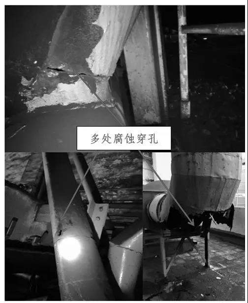 某沿海火力發電廠輸煤系統的干式靜電除塵器使用的是福建衛東環保科技股份有限公司生產的MZZ4-2型高壓干式靜電除塵器,2007年投用,采用的是四電場立式結構,電場采用L型SPCC板和管狀針刺線,同極間距110mm,風量24000m3,出口含塵量90mg/m3。隨著該廠大量使用印尼煤(每年占60%),設備腐蝕情況尤為嚴重,兩臺除塵器的除塵效率、除塵效果和防火防爆要求已不能滿足當前運行工況。目前干式靜電除塵器主要存在殼體、風管多處腐蝕穿孔(風管腐蝕見圖1),電場腐蝕變形、脫落等問題。